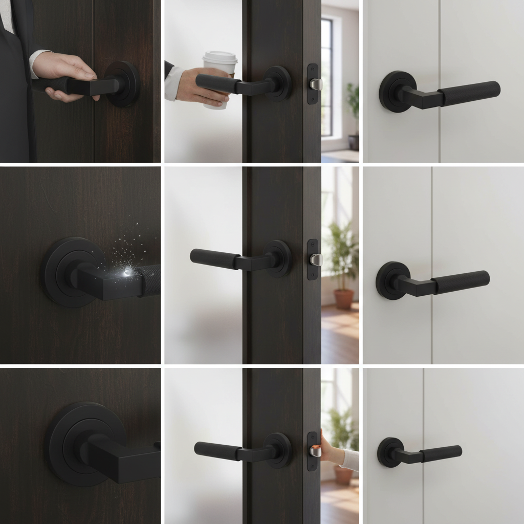 MHR200MB Millhouse Brass Cartwright Knurled Lever Door Handle on Round Rose – Matt Black