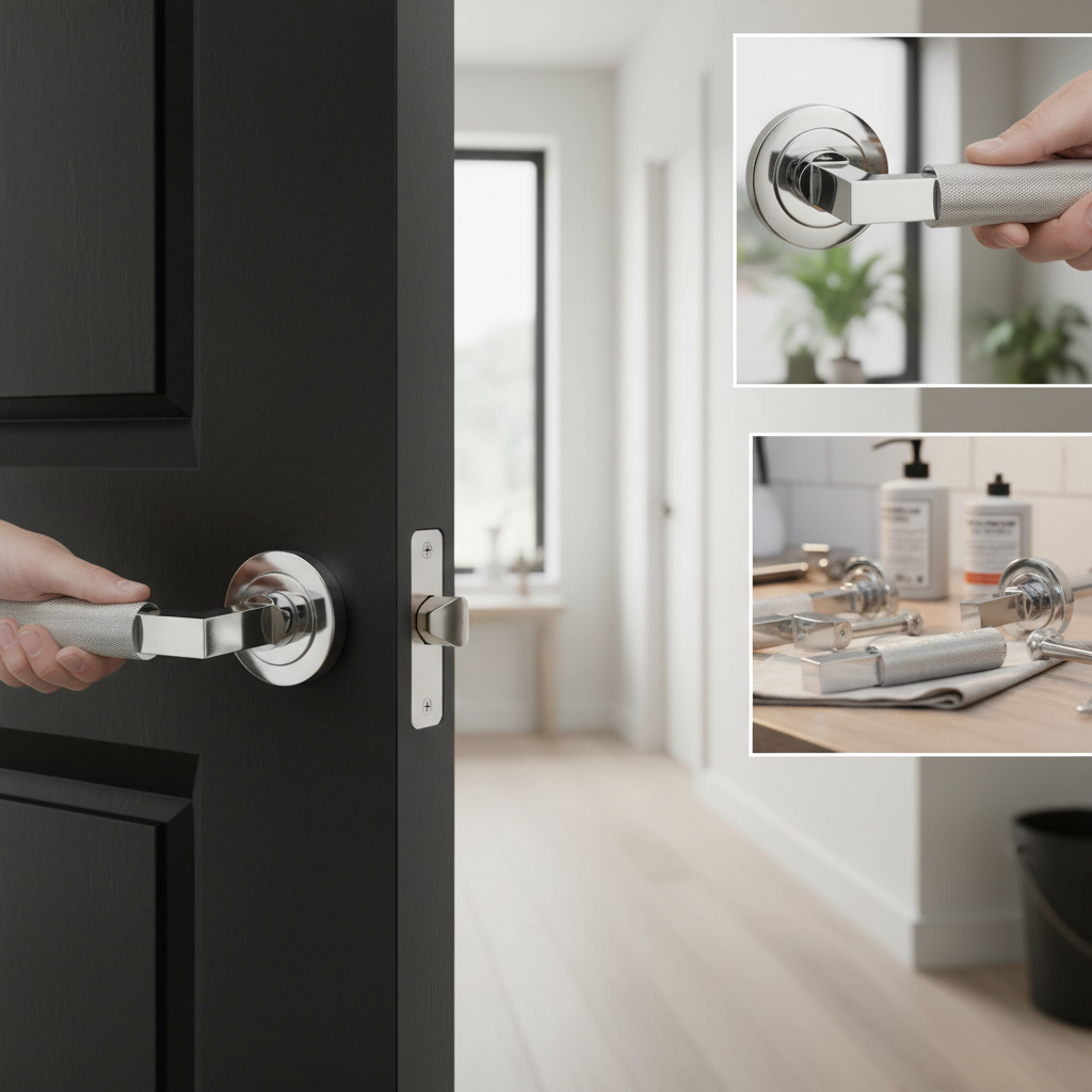 MHR200PC Millhouse Brass Cartwright Knurled Lever Door Handle on Round Rose – Polished Chrome