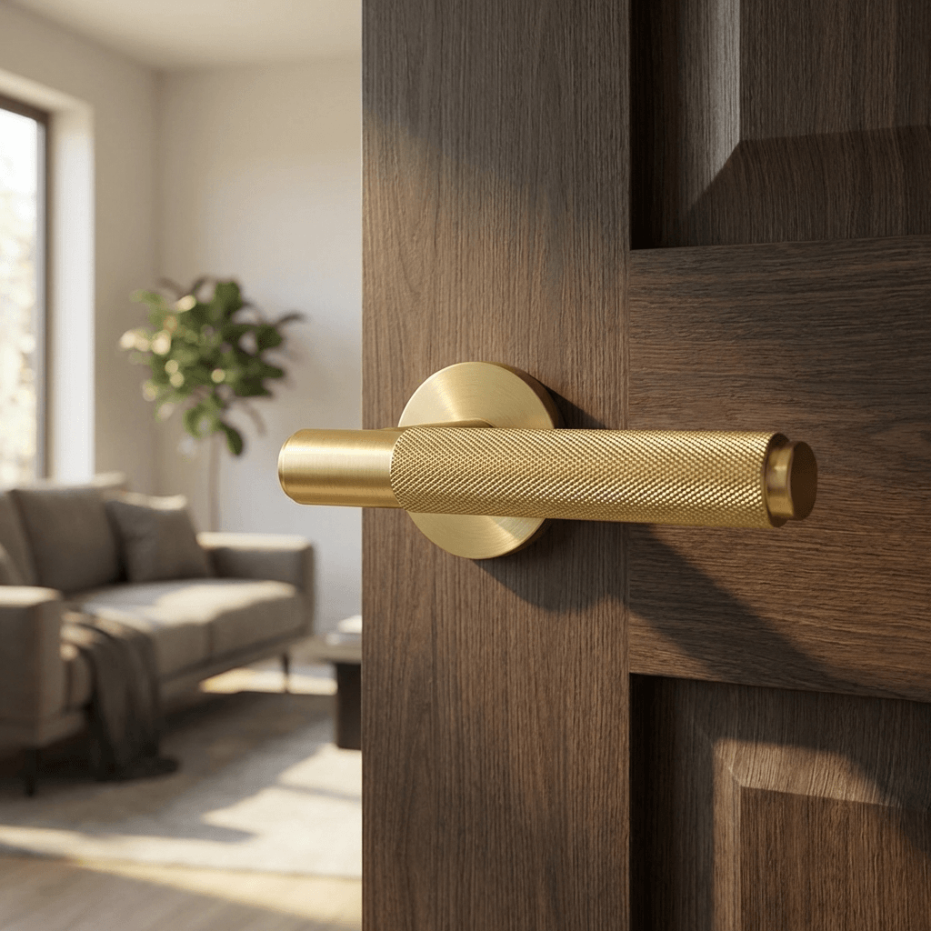 MHSR100SB Millhouse Brass Crompton Knurled Lever Door Handle on 5mm Slimline Round Rose – Satin Brass