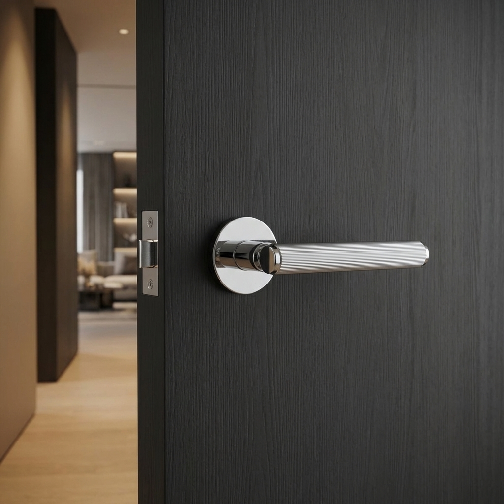 MHSR250PC Millhouse Brass Stephenson Knurled Lever Door Handle on 5mm Slimline Round Rose – Polished Chrome