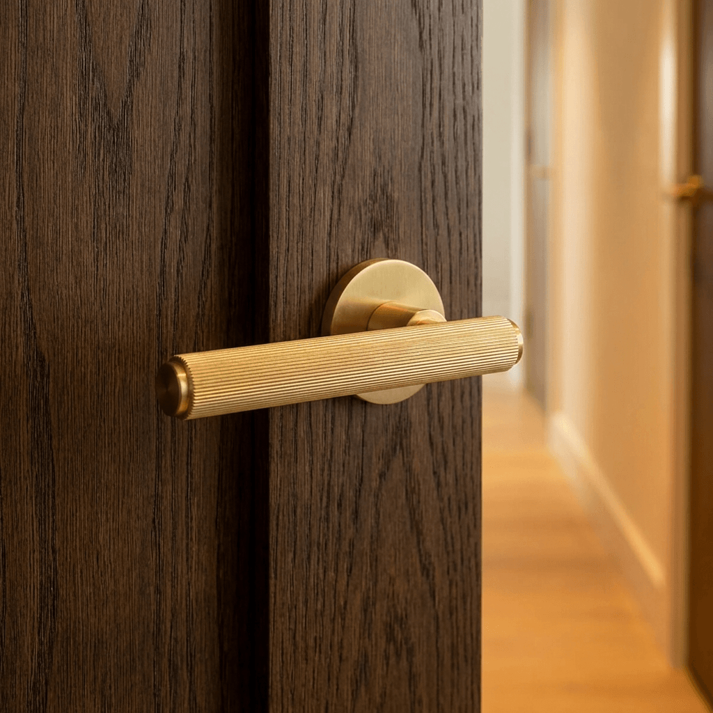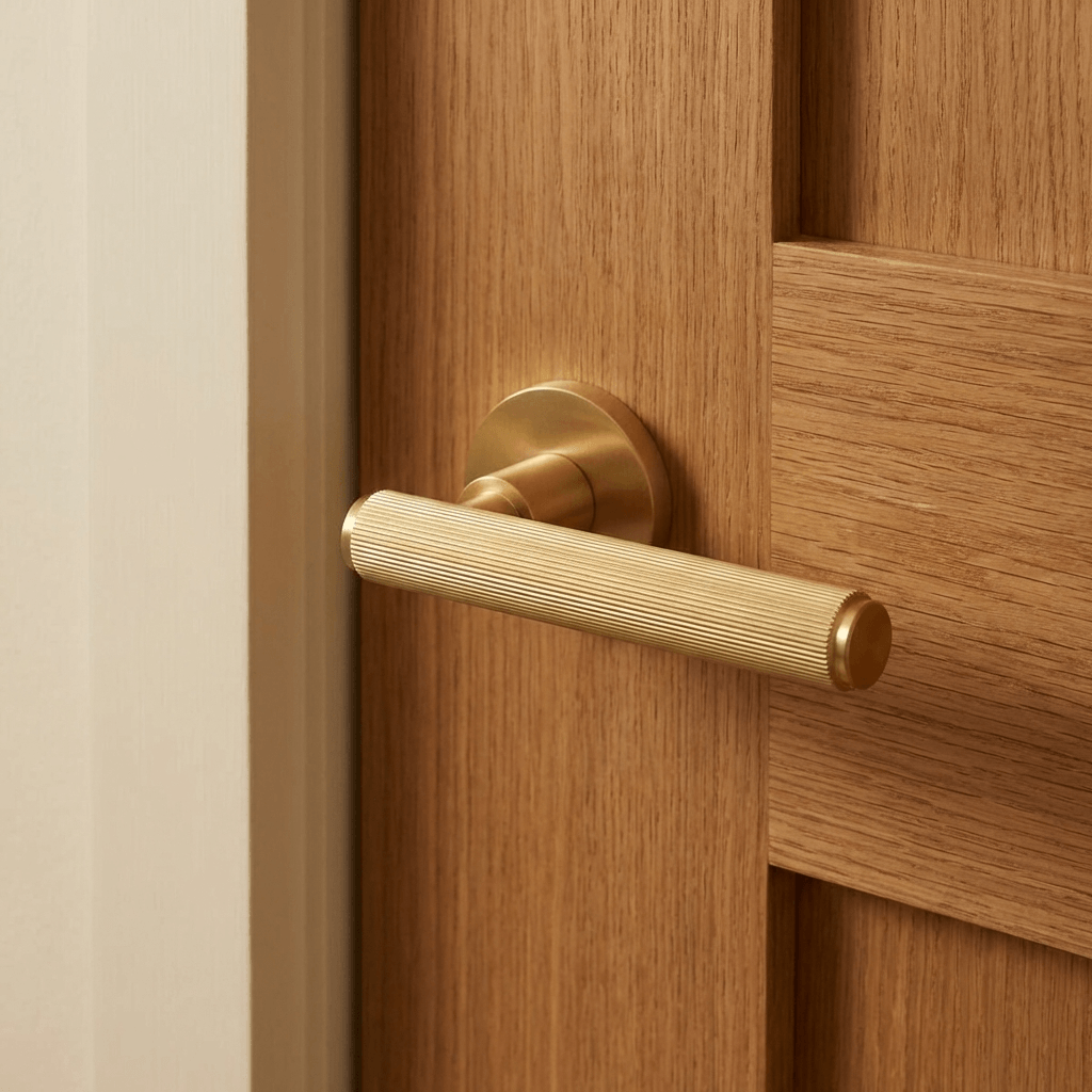 MHSR250SB Millhouse Brass Stephenson Knurled Lever Door Handle on 5mm Slimline Round Rose – Satin Brass