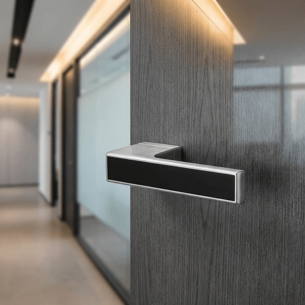 T3089LMBSC Tupai Rapido VersaLine Tobar Lever Door Handle on Long Rose – Pearl Black Decorative Plate – Satin Chrome